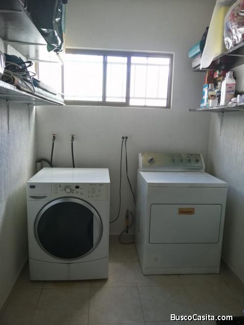 Sala, comedor, cocina, tres recamaras con aire acondicionado, tres baños completos, cuarto de lavado, garage techado para dos autos, una pequeña bodega, boiler y tanque estacionario.