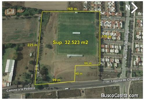 Terreno con topografía plana, con 97 metros de frente sobre avenida camino a la Pedrera, muy bien ubicado con plusvalía en crecimiento por los desarrollos vecinales. Ideal para desarrollo habitacional, escuela, centro deportivo, etc. Cuenta con todos los servicios, Líneas de camión y comercios disponibles, escriturado y libre de gravamen. Uso de suelo H3. Superficie: 32,523 m2. a razón de $2,500 x m2