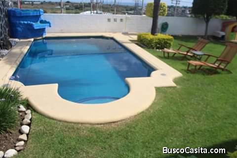 Casa de dos niveles, cuatro recámaras con baño y closets cada una, cocina equipada, Terrazas, palapa, alberca, jardín, portón eléctrico, celdas solares