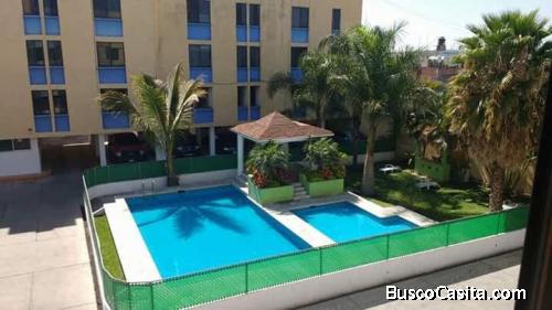 Venta de departamento remodelado en Cuautla, dos recámaras, baño completo, sala, comedor, cocina equipada, área de lavado y tendido, estacionamiento, portón eléctrico, cisterna, áreas comunes, chapoteadero y alberca, palapa y asador